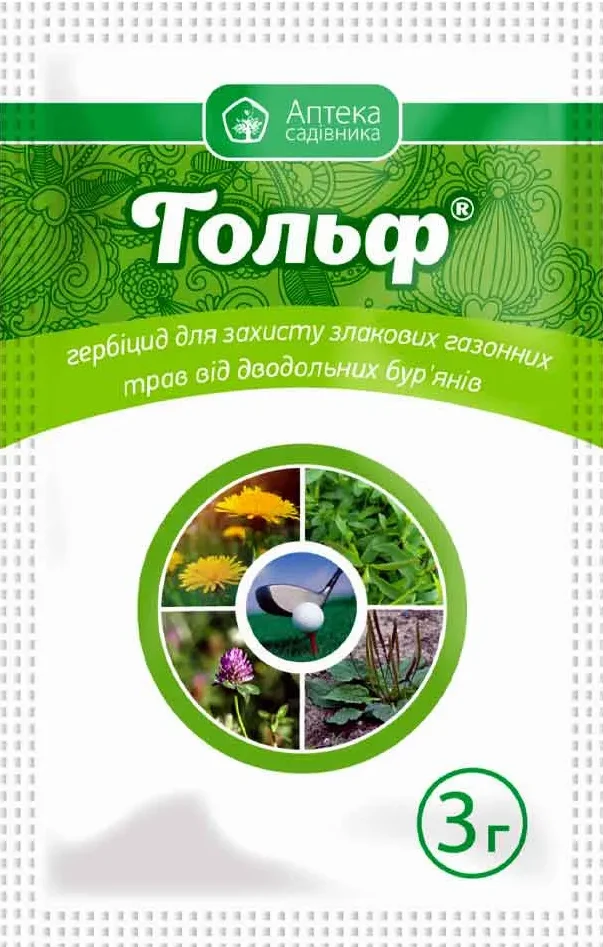Вага 3 г. Гольф — системний післясходовий гербіцид. Призначений для знищення найбільш поширених однорічних та багаторічних бур’янів в посівах газонних злакових трав. Активні речовини — дикамба і метсульфурон-метил. Препарат Гольф, протягом 1-3 годин, проникає в бур’ян через його надземну частину і поширюється по всіх життєво важливих точок, включаючи кореневу систему. Ріст бур’янів припиняється в перший же день. Візуальні ознаки загибелі бур’янів стають помітними вже на 5-7 день після застосування (втрата тургору, пожовтіння листя). Абсолютна загибель настає через 3-4 тижні.