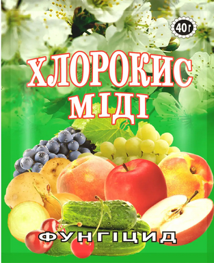 Вага 40 г. Фунгіцид контактної дії Хлорокис міді, виготовлений на основі міді, застосовується для лікування та профілактики овочевих, плодово-ягідних та сільськогосподарських культур у вегетаційний період від різних захворювань. Цей препарат містить у складі хлорокис міді. Препарат є прямим аналогом бордоської рідини, на відміну якої може застосовуватися в період активного розвитку рослин. Після обприскування препарат добре закріплюється на листі та перешкоджає проникненню патогенних спор грибів. Препарат Хлорокис міді ефективно використовується для картоплі, буряків, томату, огірків, цибулі, яблуні, груші, персика, сливи, вишні, айви, винограду та інших від фітофторозу, макроспоріозу, альтернаріозу, церкоспорозу, антракнозу, парші, мілд.