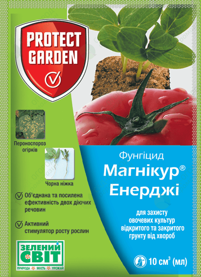 Вага 10 мл. Магнікур Енерджі – фунгіцид системної дії з ефектом стимуляції росту рослин, застосовується проти пероноспорозу та кореневих гнилей на огірках та на томатах – проти кореневих гнилей.