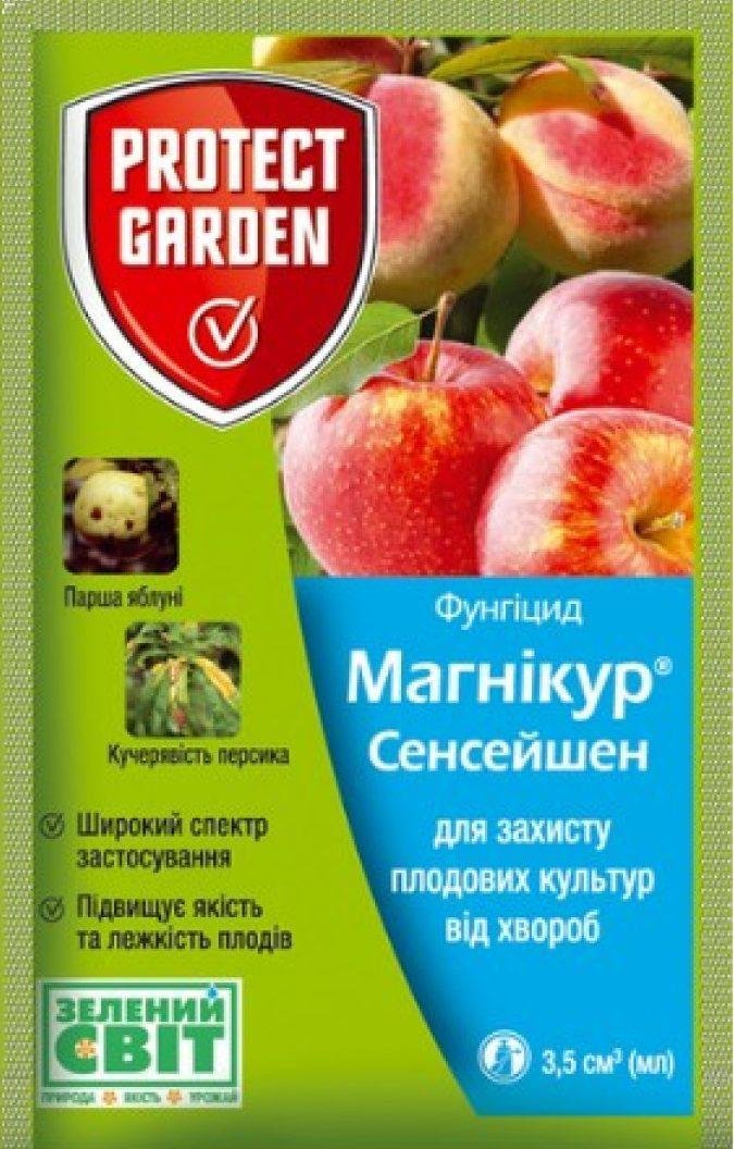 Вага 3,5 мл. Магнікур Сенсейшен – новий системно-трансламінарний фунгіцид для боротьби з хворобами плодових. Флуопірам, 250 г/л, Трифлоксистробін, 250 г/л Препаративна форма: Концентрат суспензії Механізм дії: Флуопірам – блокування мітохондріального дихання у клітинах патогену (комплекс II), трифлоксистробін – блокування мітохондріального дихання у клітинах патогену (комплекс ІІІ). Магнікур Сенсейшен – ще один препарат із інноваційної сім’ї Луна®, розроблений для захисту плодових культур. Відзначається широким спектром впливу на патогени як зерняткових, так і кісточкових культур. Магнікур Сенсейшен ЗАСТОСУВАННЯ Яблуня Парша, борошниста роса, моніліальна гниль, хвороби зберігання – 0,3-0,35 л/га Максимальна кількість обробок – 2 Термін очікування – 20 днів. ПЕРСИК Моніліальний опік, кучерявість листя, плодова гнилизна, борошниста роса – 0,25-0,35 л/га Максимальна кількість обробок – 3 Термін очікування – 30 днів. Вишня Черешня Моніліальний опік, кокомікоз, плодова гнилизна – 0,25-0,35 л/га Максимальна кількість обробок – 3 Термін очікування – 30 днів. СУМАРКА * Сіра гниль, плямистості – 0,6-0,8 л/га Максимальна кількість обробок – 2 Відсутня за використання відповідно до тарної етикетки та інструкції щодо застосування. Можливим є прояв фітотоксичності на пелюстках у разі застосування препарату в період цвітіння на сприйнятливих сортах яблуні, зокрема Голден Делішес (сортові особливості). Відсутня за умови дотримання рекомендацій щодо кількості обприскування препаратом протягом сезону. Препарат безпечний для довкілля та корисних організмів агроценозу. ПЕРЕВАГИ Новий механізм на патоген. Ефективний проти широкого спектра збудників хвороб. Ключовий елемент інтегрованої системи захисту плодових. Довготривалий захист із забезпеченням віддаленого ефекту проти хвороб зберігання – підвищення якості та термінів лежкості продукції. Відсутність перехресної резистентності